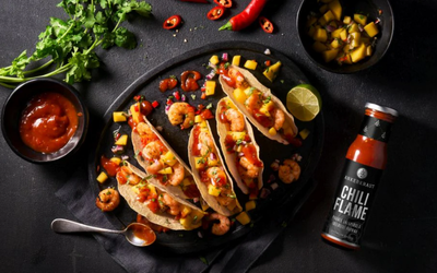 Knusprige, gewürzte Garnelen serviert in warmen Maistortillas mit einem erfrischenden Krautsalat.
