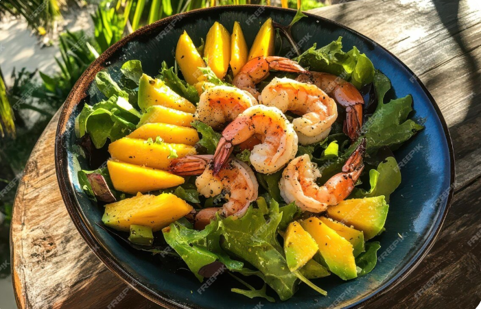 Ein erfrischender Salat mit saftigen Garnelen, tropischen Früchten und knackigem Gemüse, ideal für warme Tage oder als leichtes Vorspeisen-Gericht.