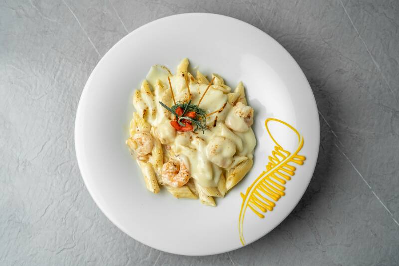 - Die fertige Pasta unter die Garnelen-Sahne-Sauce mischen und servieren.